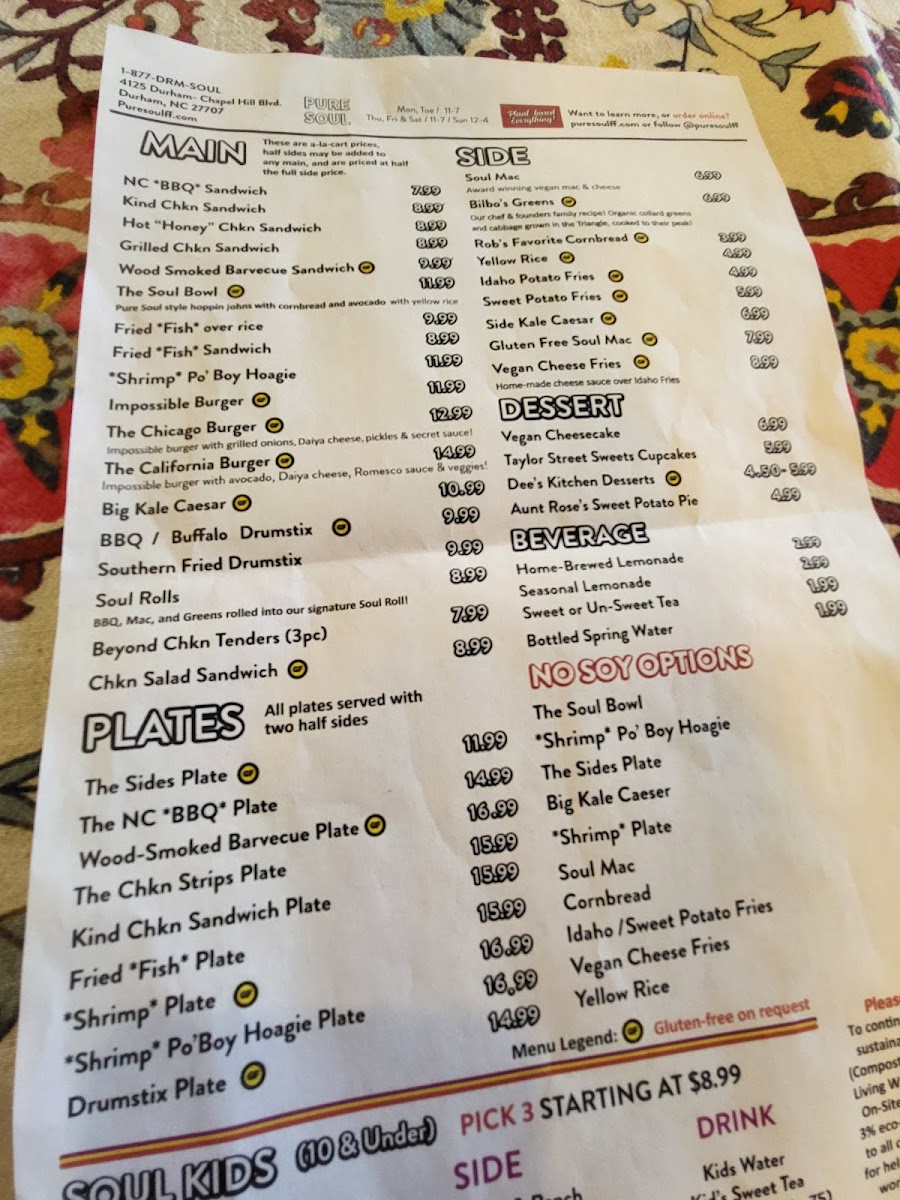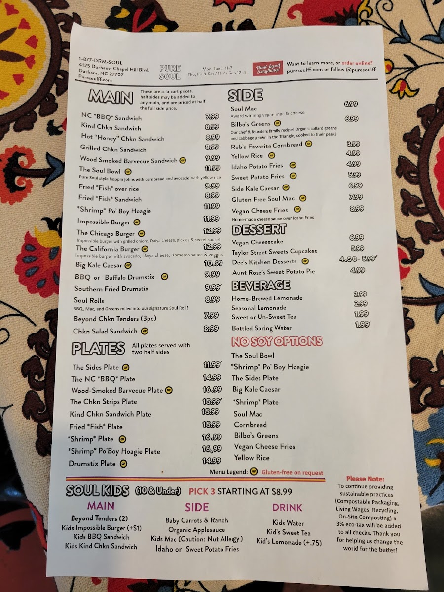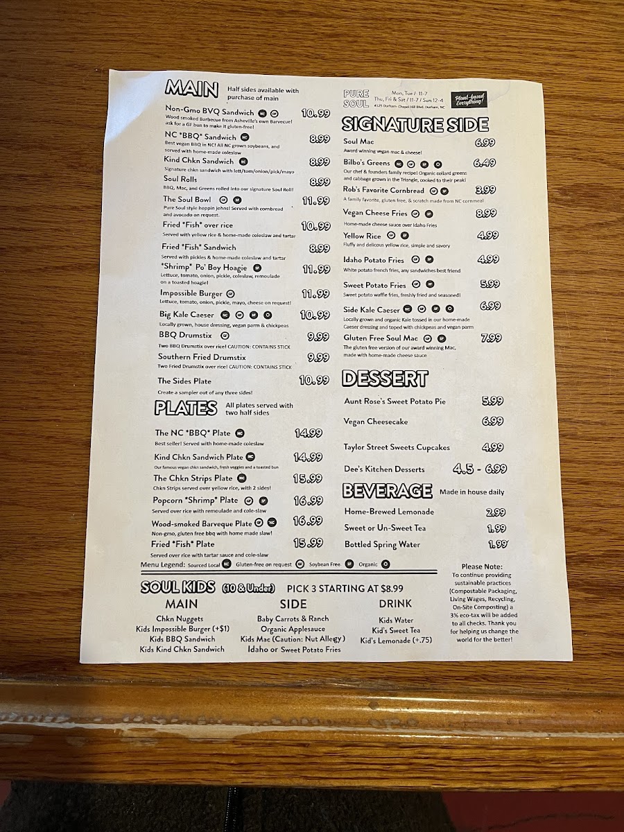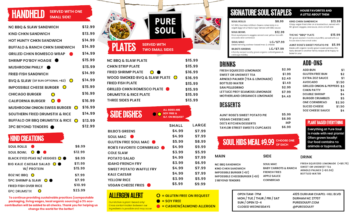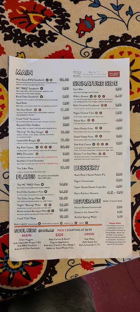 Welcome to Pure Soul, where plant-based cuisine meets comfort food in an extraordinary way. Located in Durham, NC, this hidden gem has quickly risen to fame, celebrated for its innovative vegan offerings. The menu shines with highlights like the NC BBQ Sandwich, featuring soybeans served "pulled pork" style, and the Eastern BBQ Sandwich, a gluten-free delight that pays homage to traditional Southern flavors. Guests rave about the experience, describing it as “the best food I’ve ever had in almost a decade of being vegan.”