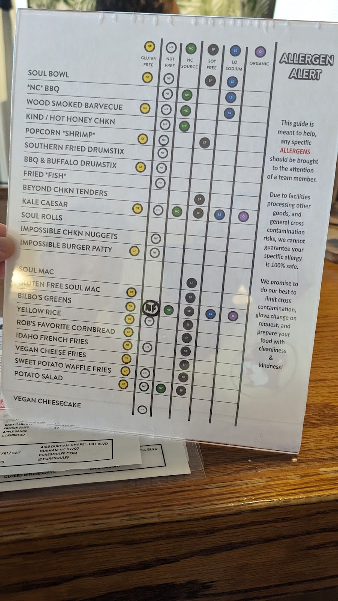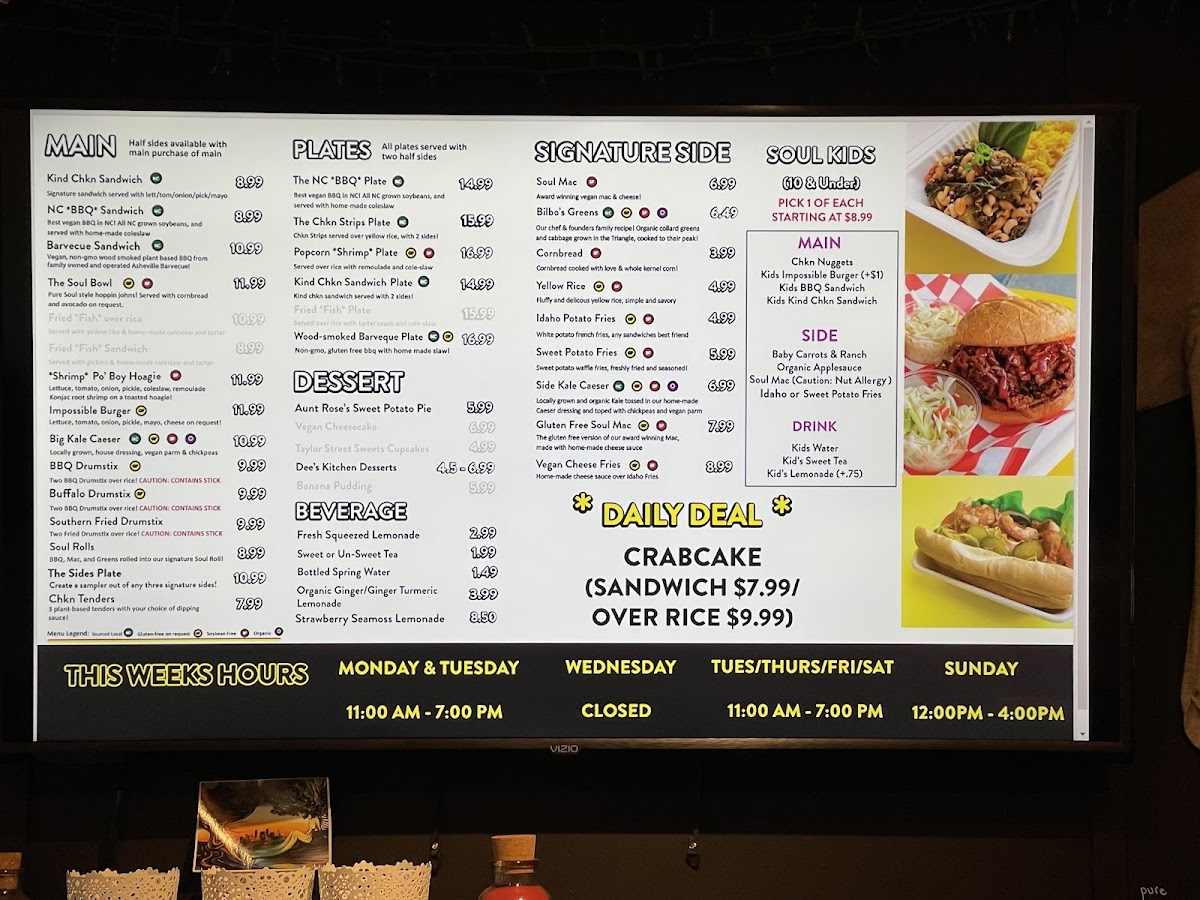 Other must-tries include the signature Kind Chkn Sandwich and a range of soul food inspired dishes, from collards to mac and cheese stuffed rolls. Diners, both vegan and omnivorous, leave feeling satisfied and eager to return. With its inviting outdoor seating and friendly staff, Pure Soul offers a delightful dining experience, cementing its status as a top spot in the RDU area for anyone seeking flavor-packed, soul-warming meals.